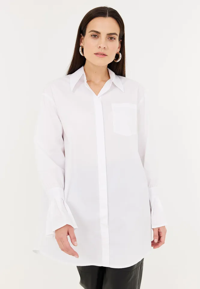 Отличный выбор — модная белая рубашка-туника с интересными расклешенными рукавами. Попробуй носить ее с кожаными брюками и акцентной обувью – получится простой, но стильный и сбалансированный лук на каждый день. Также ты можешь носить ее нараспашку поверх базовой водолазки и джинсов. Если хочешь подчеркнуть талию и сделать силуэт более выразительным, добавь кожаный пояс.