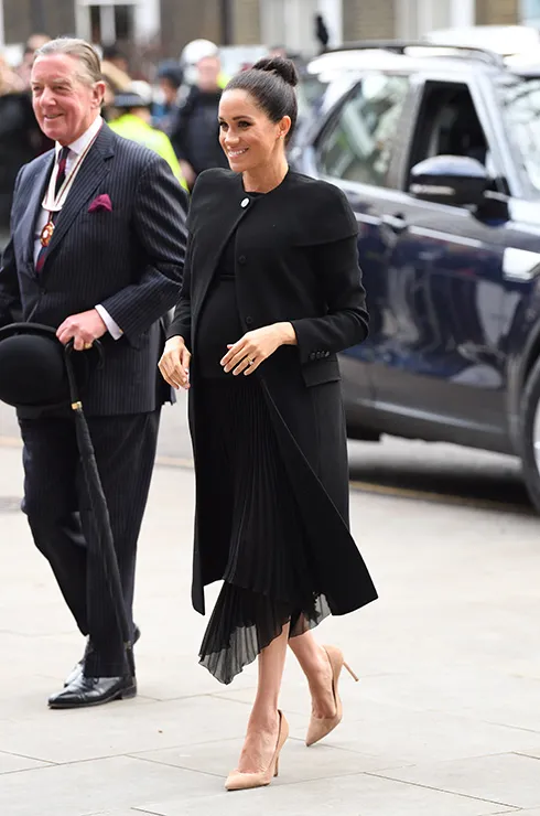 Меган Маркл, будучи в положении, демонстрирует стиль и элегантность. Легкую плиссированную юбку она решила соединить с интересным пальто, имеющим круглую кокетку на плечах. Образ дополнили изящные туфли-лодочки бежевого цвета.