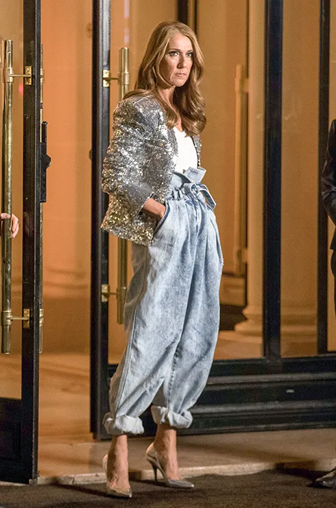 Певица Селин Дион снова удивила поклонников стильным нарядом. Широкие джинсы с высоким поясом она надела с серебристым жакетом, украшенным пайетками. Широкие штанины, подвернутые внизу, контрастировали с женственными лодочками, демонстрируя изящество щиколоток знаменитости. А в качестве нижнего слоя под такой эффектный жакет Селин выбрала простую белую футболку.