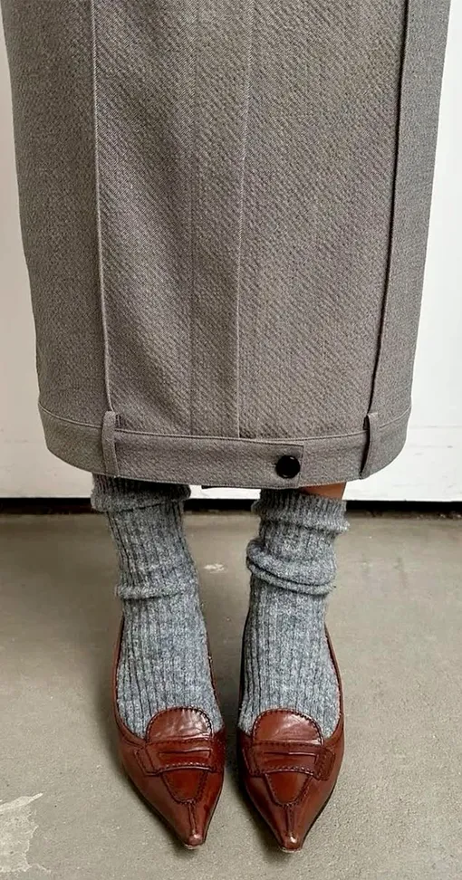 Тонкие кашемировые или более объемные шерстяные, словно связаные любимой бабушкой, — носки становятся не просто способом утеплиться, но и настоящим модным акцентом. Особенно охотно инфлюенсеры носят их с юбками-карандашами миди и макси, которые популярны в текущем сезоне.