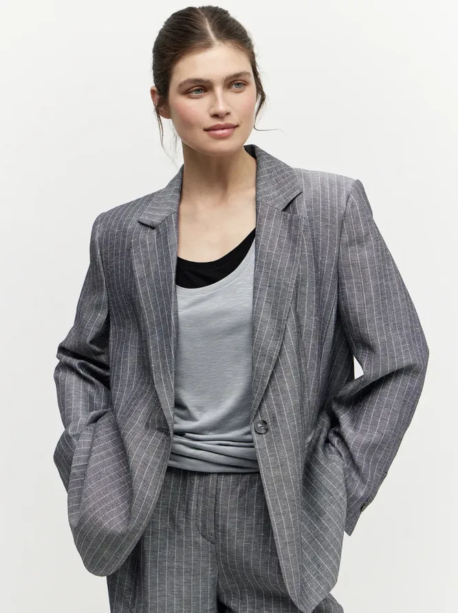 Несложное комбо Сиенна дополнила блейзером в трендовом серо-охристом оттенке. Что рекомендуем сделать и тебе, ведь кондиционеры в офисах вообще не щадят — лучше взять с собой жакет (и закатать рукава на улице), чем мерзнуть весь день.