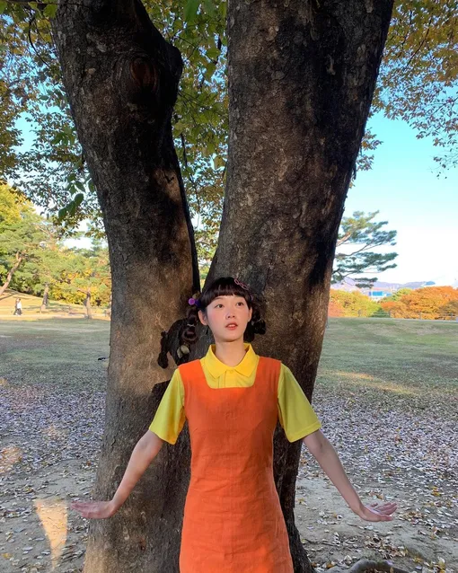 А актриса Ли Юми, сыгравшая одну из ролей в сериале, нарядилась куклой-убийцей. Вышло очень похоже и даже немного пугающе.