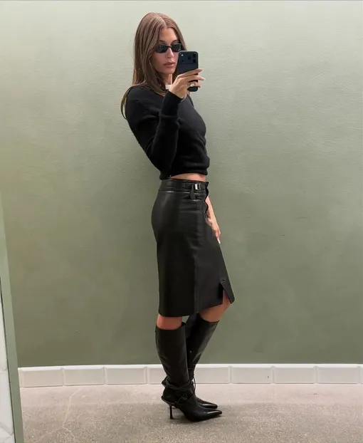 Ну а Хейли Бибер возрождает уже немного забытую эстетику «офисной сирены» и носит кожаную юбку-карандаш с джемпером и сапогами на шпильке.