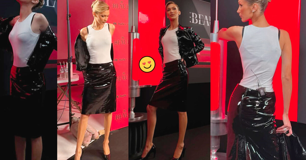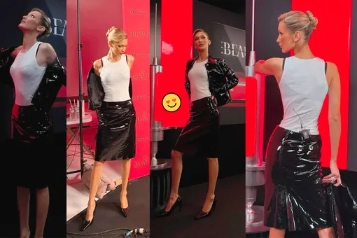 Белла опубликовала в своем блоге минималистичный лук из лакированной «двойки» Ferragamo. Костюм с юбкой и жакетом модель дополнила белой майкой и туфлями на каблуке.