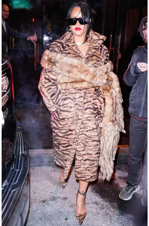 Рианна не так давно прогулялась в шубе Alaïa с тигровым принтом, дополнив лук туфлями с идентичным узором (подробнее ее образ мы уже разбирали ранее).