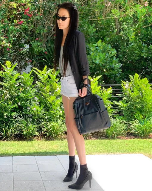 Короткие шорты из денима и классический жакет черного цвета – простое, но очень выигрышное сочетание, эффектность которого только усиливается за счет правильно подобранных аксессуаров. Черные лодочки с приспущенными плотными гольфами и объемная сумка из кожи придают этому образу выразительность и динамичность.