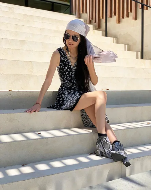 Стройные ноги и изящные руки. В солнечных очках, надежно скрывающих возрастные изменения, в таком коротком платье Вера Вонг вполне может сойти за подростка. Черно-белый принт идеально сочетается с кожей питона на ботильонах. А светлый платок на голове подчеркивает насыщенность цвета волос.