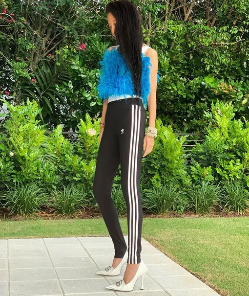 Вера Вонг любит необычные сочетания. И, надо признать, они мастер этого дела. Ее вкус позволяет носить брюки в спортивном стиле с белыми лодочками на шпильке и топом из голубых перьев. Завершает образ крупный браслет с кристаллами.
