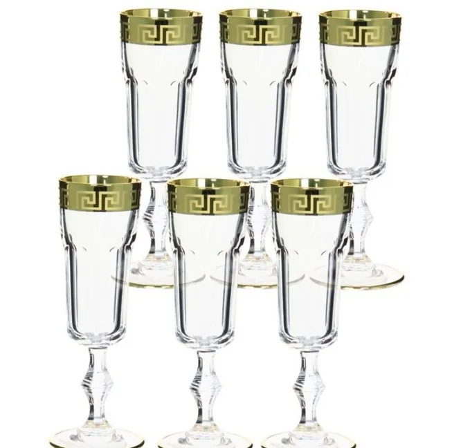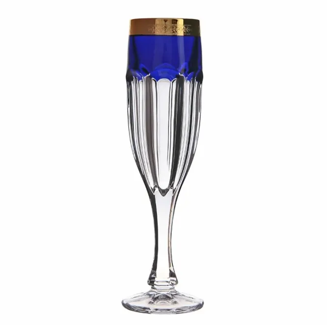 Набор бокалов для шампанского от чешского бренда Crystalite bohemia состоит из шести предметов. Производитель уверяет, что благодаря добавлению окиси титана его изделия приобретают особую прочность и их можно мыть в посудомоечной машине. Бокалы сделаны из прессованного хрустального стекла, которое позволило стеклодувам придать продукции изысканную форму, напоминающую фужеры, которые подавали при дворе чешских королей. Добавление кобальта и золота позволило мастерам украсить бокалы.