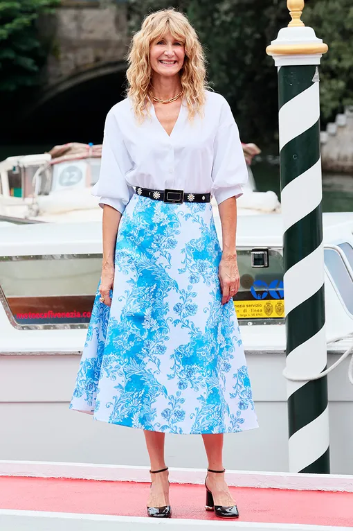 Если так просто отпускать лето еще не хочется, не грусти — Лора Дерн тебя понимает! От лука актрисы буквально веет летней морской свежестью! Лора выбрала актуальную в сезоне юбку длины миди от бренда Emilia Wickstead с бело-голубым принтом, которая стала ярким центральным элементом образа. Добавляй к нему белую рубашку и ремень (можно с долей озорства — согласись, ромашки на ремне Дерн смотрятся очень мило) — и образ готов.