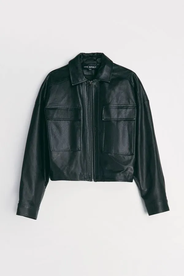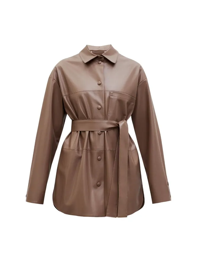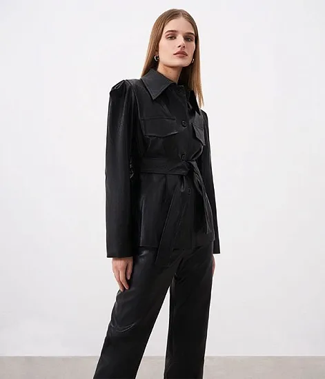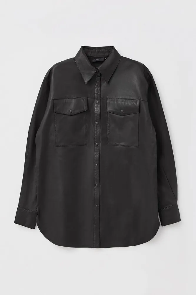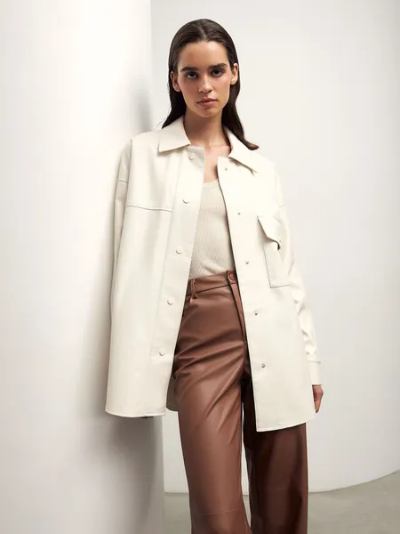 Вообще рубашечный крой и кожа — прекрасное сочетание. С одной стороны, у нас есть базовая и очень удобная форма, с другой — фактурный материал, который делает образ интересным. Заметила, как «интеллигентно» блестит куртка? Это именно то, что мы ищем на весну: свечение на матовой поверхности. Глянец, конечно, никто н запрещает, но на изделиях с большой площадью он может выглядет дешево.