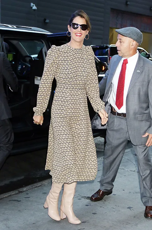В моде платья миди с цветным принтом. И очень круто, когда обувь подобрана в тон платью – его базовому цвету или одному из оттенков принта. Коби Смалдерс надела сапоги цвета кофе с молоком, подчеркнв графичность принта на платье.