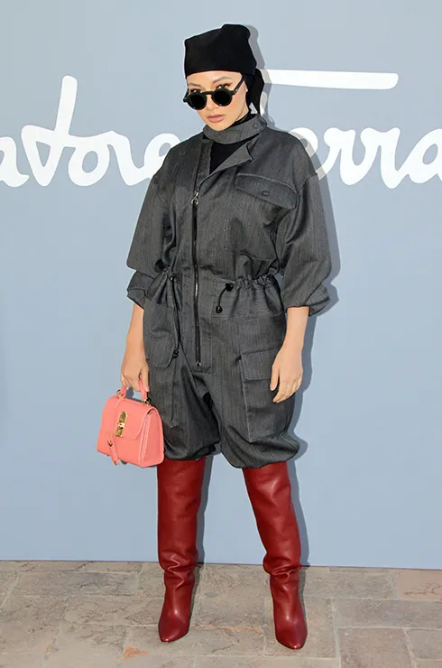 Насыщенная винная и бордовая обувь хорошо сочетается с черной и серой одеждой, которой так много в нашем зимнем гардеробе. Сапоги такого цвета подчеркивают сдержанность одежды и в то же время делают образ ярче. Нур Нилофа использовала этот прием для сочетания с закрытым комбинезоном цвета графита.