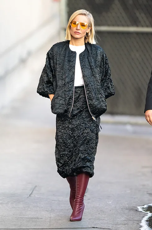 Впрочем, черно-белые комплекты хорошо смотрятся и в сочетании с более спокойными оттенками. Кристен Белл выбрала бордовые сапоги для сочетания с черным костюмом из жатой ткани и белой базовой футболкой.