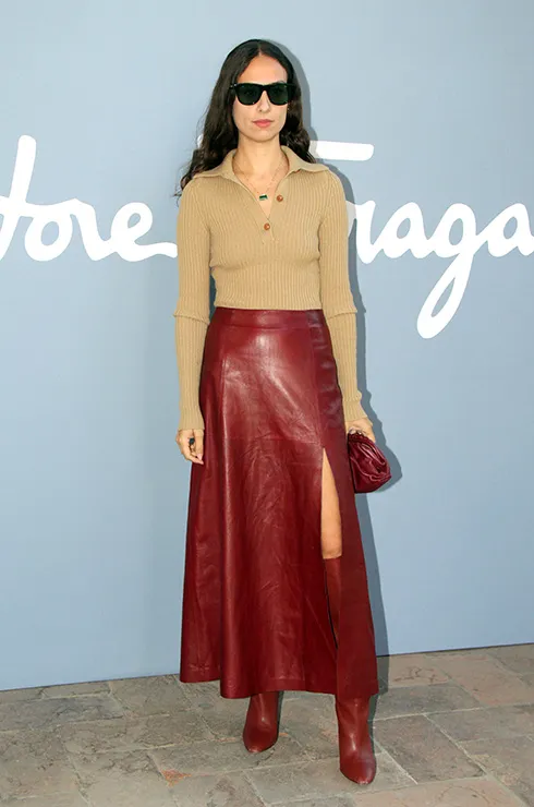 Высший пилотаж, когда сапоги сочетаются по цвету с пальто, юбкой или брюками из кожи. Такой образ сразу выглядит продуманным и очень стильным. Эрика Болдрин пошла чуть дальше и выбрала в тон юбке и сапогам еще и сумку, разбавив сочетание трикотажным топом нейтрального телесного оттенка.