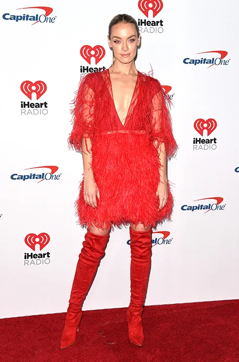 Наоми Скотт решила добавить к ярко-красным брюкам и куртке ботинки точно в тон. Хороший прием, позволяющий визуально удлинить ноги.
