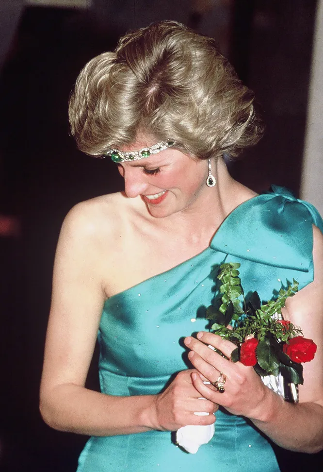 На вечере Диана появилась в бирюзовом асимметричном платье, созданном британским дизайнером Элизабет Эмануэль, которая, к слову, была автором и свадебного наряда Дианы. А дополнять наряд должно было ожерелье из бриллиантов и изумрудов, которое изначально принадлежало Марии Текской, супруге короля Георга V и бабушке Елизаветы II.