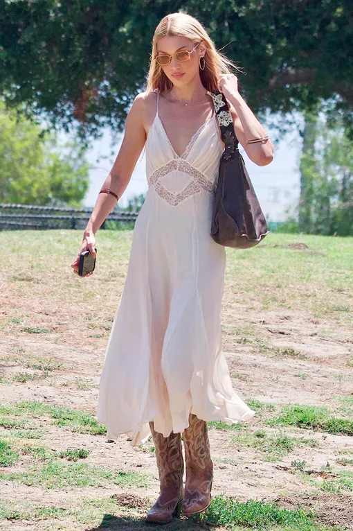 Хотим быть в курсе актуальных трендов - смотрим, в чем ходит Белла Хадид! Модель, конечно, и сама часто стоит на гребне зарождающихся модных тенденций, но тут последовала за большинством — а оно этим летом без ума от стиля бохо. Струящееся платье-комбинация с кружевными вставками идеальный выбор для жарких дней. Обувать казаки, как Белла, в жару, конечно, необязательно — такой фасон отлично сочетается и с сандалиями.