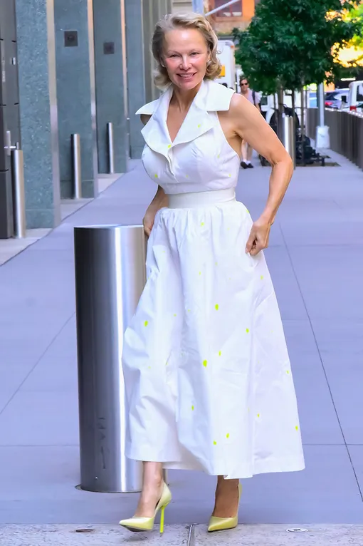 В последнее время актриса превратилась в настоящую фэшн-икону, образы которой не сходят со страниц модных журналов, и это платье с лацканами от нью-йоркского бренда One Of — еще один лук, который можно брать на заметку. Лимонные «кляксы» на ткани и туфли в тон им заметно оживляют базовый образ.