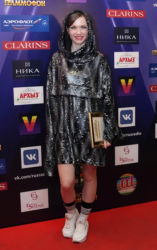 Еще одной любительницей блесток оказалась Елена Князева, появившаяся на красной дорожке в сверкающем балахоне, дополненном вуалью и кроссовками в сочетании с высокими носками. Необычный образ певицы подошел бы для модной вечеринки, но на светском событии смотрелся откровенно странно.