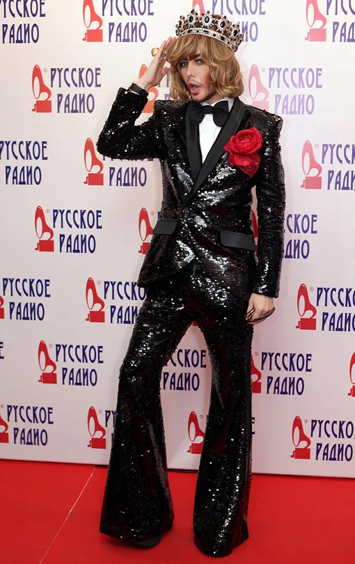 Конечно же, остромодные блестки не могли не привлечь в ряды своих адептов Сергея Зверева. Свой переливающийся костюм артист дополнил гигантской алой розой и, конечно же, своим излюбленным аксессуаром — короной.