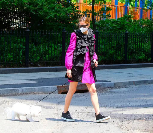 Во время карантина даже прогулка с собакой становится настоящим праздником, именно поэтому Оливия Палермо решила надеть всё самое лучшее. Зачем откладывать до конца карантина то, что можно носить уже сегодня (даже если это странная жилетка с рюшами в сочетании с платьем-плащом цвета жгучей фуксии).