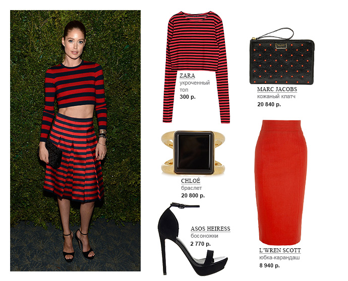 Черный и красный — еще один классический прием, который модель обыгрывает по-своему. Главный акцент — полосы разной ширины, но выдержанные в одной цветовой гамме. Крус не боится идти ва-банк и выбирает горизонтальную полоску — что позволительно с ее идеальной фигурой. Для тех кто не хочет рисковать, мы рекомендуем выбрать однотонный вариант одного из элементов образа.