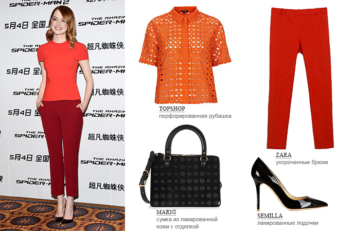 Эмма Стоун (Emma Stone) — одна их самых улыбчивых и позитивных актрис в Голливуде, что, конечно же, не могло не отразиться на ее стиле. Например, комплект из плотного оранжевого топа и брюк алого цвета от Roland Mouret с пекинской пресс-конференции нам нравится за свою практичность и утонченность. Простой, но яркий образ не только поднимает настроение, но и привлекает внимание. Не бойся примерить более сложносочиненные топы! Но делая ставку на такой яркий повседневный наряд, в обуви и аксессуарах придерживайся спокойной палитры.