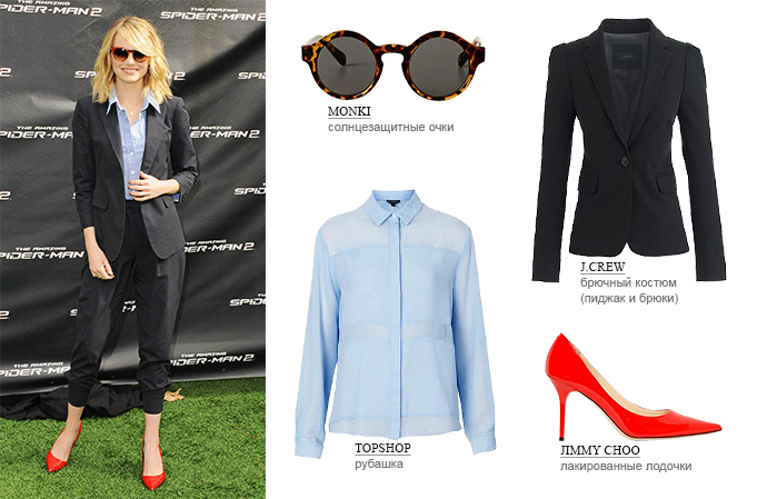 Если желтые туфли – это мимолетный звездный тренд, то простые красные лодочки – это уже классика. На фотоколл второго фильма о Человеке-пауке, Эмма выбрала костюм с классической рубашкой, очки в круглой оправе и яркую пару обуви от Kurt Geiger с фигурным каблуком.