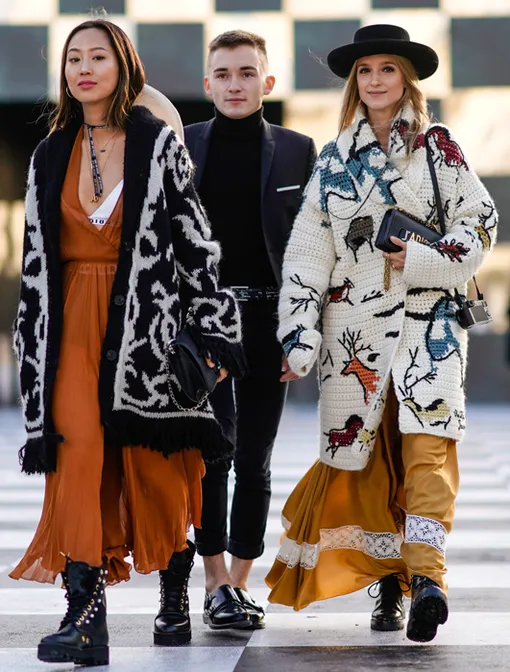 Как насчет толстых вязаных кардиганов с узорами вместо пальто? Эйми Сонг и Шарлотт Гроенвельд показывают, как правильно комплектовать их. С шифоновыми платьями и грубыми ботинками со шнуровкой.