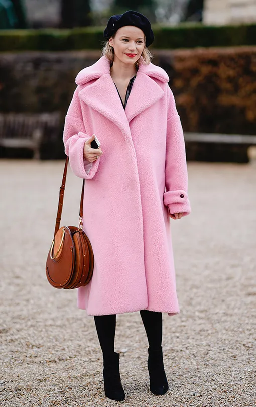 Немного классики в духе Dior: гостья показа парижского модного дома в пальто десертного оттенка и берете. Хорошо, что комплект разбавлен большой круглой сумкой, иначе бы «слиплось».