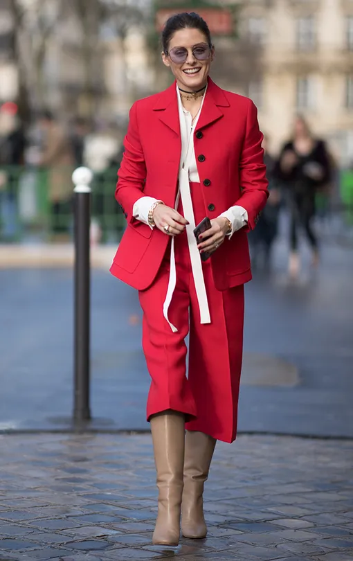 Брючный костюм? Почему бы и нет, если он, как у Оливии Палермо, состоит из удлиненного жакета и кюлотов. Блуза с бантом и сапоги на толстом каблуке дополнят образ в стиле 70-х.