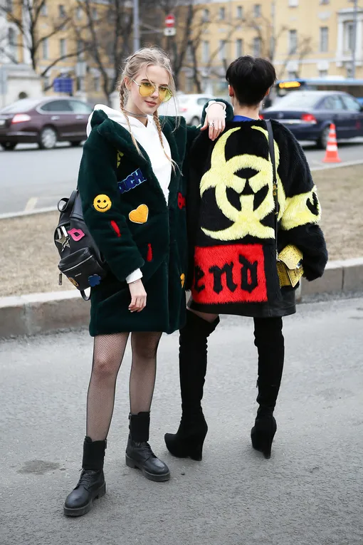 Мы такие разные, но все-таки мы вместе... У девушки в красном пальто все хорошо, а девушке в оранжевом я бы посоветовала белые носки заменить на носки одного из оттенков, присутствующих в одежде. Образ классный и явно тщательно продуманный, а носки мало того, что притягивают внимание на фото (я не виновата, это оптика), так еще и выглядят как недодуманная деталь — как будто без носок было плохо, а найти подходящие не было времени.