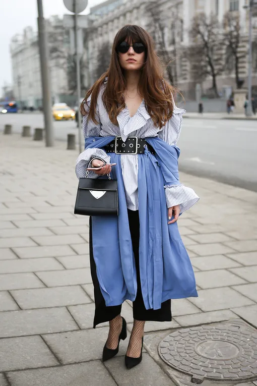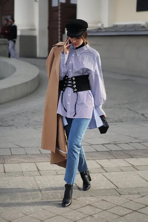 Отличный образ: собрано воедино сразу несколько трендов (бело-голубая полоска в сочетании с бежевым, рубашка оригинального кроя с длинным рукавом, водолазка под рубашку, пояс со шнуровкой), при этом выглядит все скромно и элегантно.