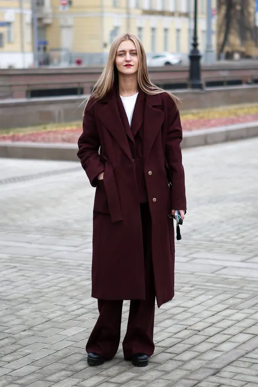 В грядущем осенне-зимнем сезоне отчетливо прослеживается тренд на такое трио: брючный костюм и пальто из одинаковой ткани. Так что девушка – в авангарде моды!