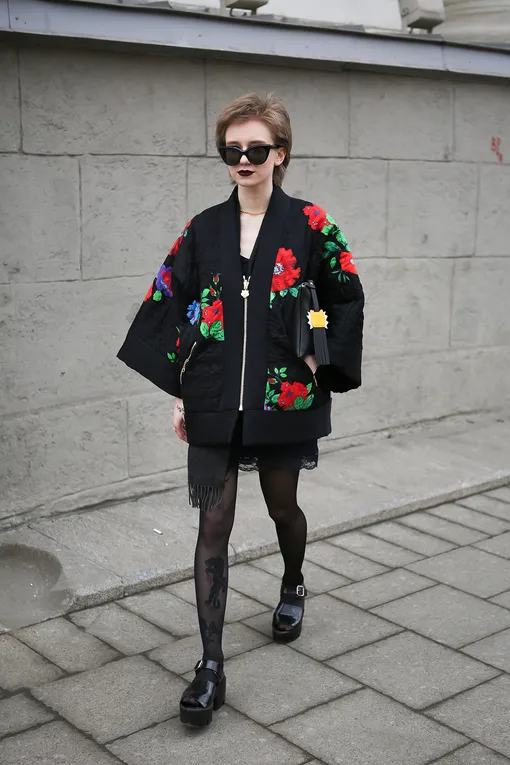 Чего-то не хватает... Возможно, брюк?! Девушка выглядит как гриб в этом объемном кимоно, надетом поверх мини-платья. Я думаю, с широкими короткими брюками или юбкой длины миди этот образ был бы более интересным.