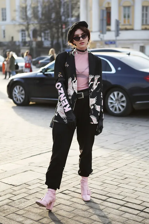 Мне не понятно, зачем здесь перчатки — девушка выглядит как киборг. Без них было бы не хуже! Я бы убрала перчатки и надела длинную юбку (примерно до голенища обуви) вместо этих брюк с резинками – было бы почти то же самое, но более classy.