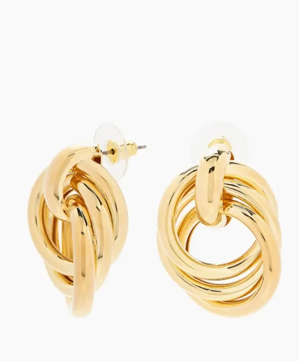 Если ты носишь серьги, то обрати внимание на стильную пару золотистого цвета с переплетающимися звеньями. простой, но в то же время интересный и фактурный аксессуар, который привлекает внимание.