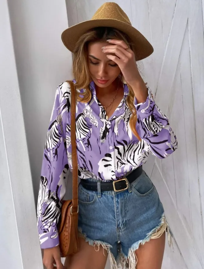 Сиреневая блузка с зебрами идеально впишется в летний гардероб. К ней подойдут летящие юбки с разрезами, джинсовые и льняные шорты, свободные брюки.