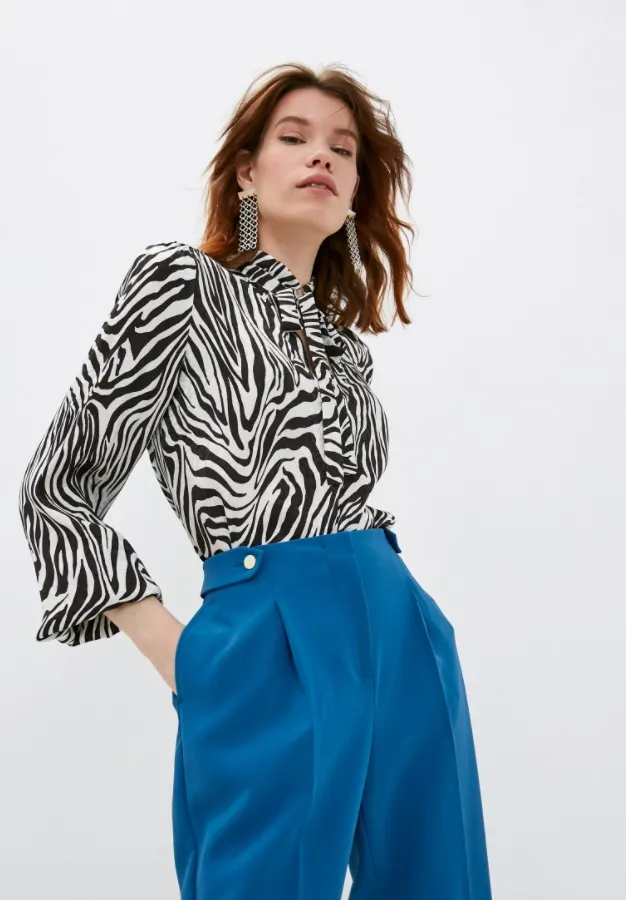 В офисные комплекты отлично впишется черно-белая блузка с зебровым окрасом.