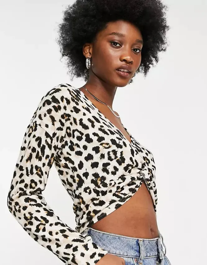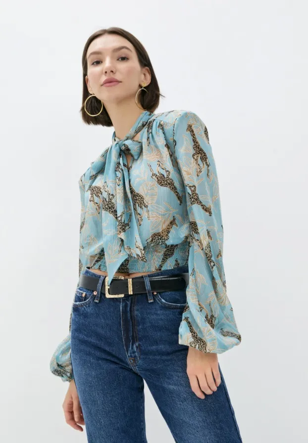 Блуза с ненавязчивым леопардовым принтом и узлом на груди выгодно подчеркнет талию и бюст.