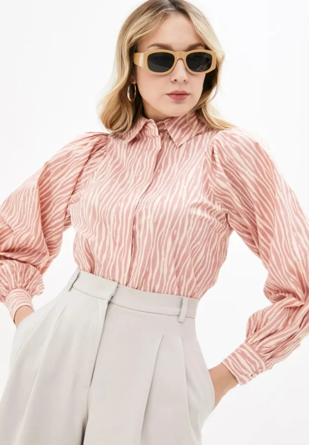 Бежево-розовая блузка с принтом «зебра» – отличная основа элегантного образа. Лучшим дополнениями к ней станут бежевые брюки-бананы или палаццо и кожаные лоферы.