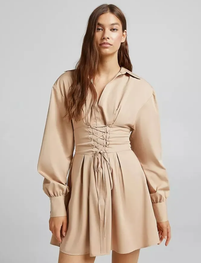Бежевое мини-платье со шнуровкой на талии поможет создать соблазнительный силуэт.