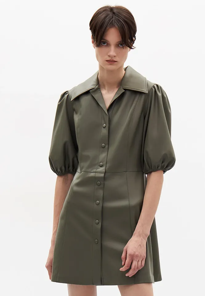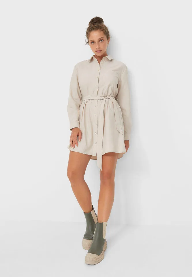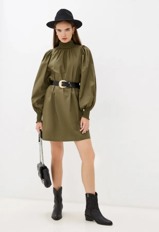Цвет хаки по-прежнему в тренде. Дополни это платье ремнем, чтобы подчеркнуть талию, высокими сапогами и небольшой фактурной сумкой через плечо.
