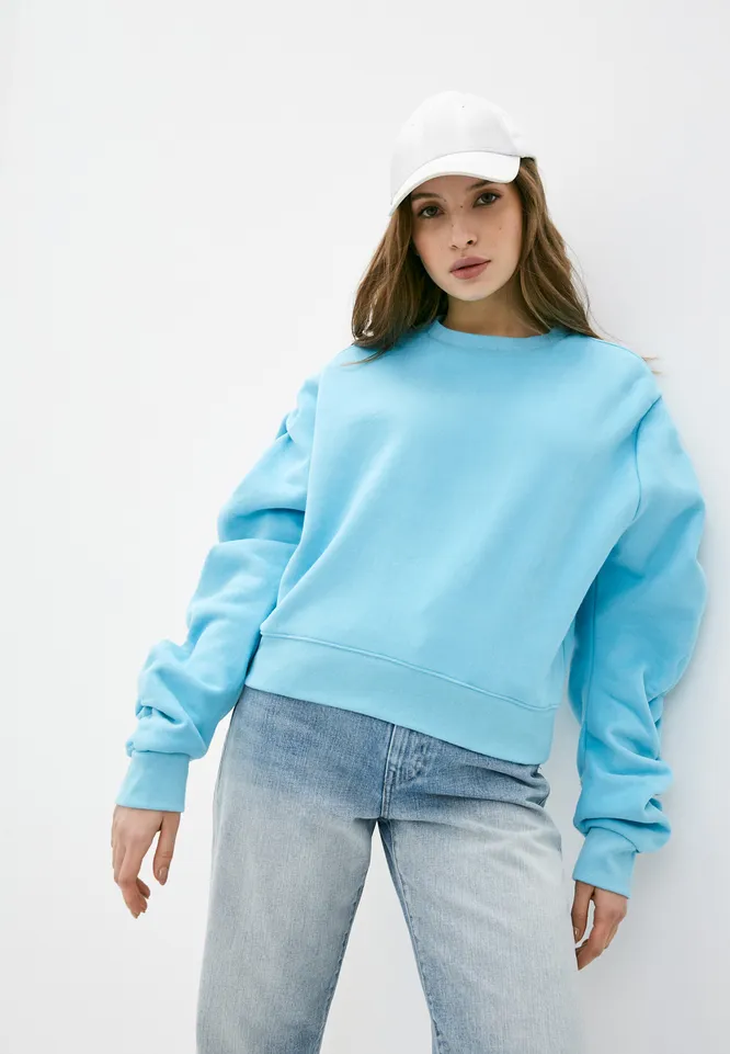 В этом голубом свитшоте со сборками на рукавах можно пойти даже на вечеринку. Дополняй его узкими джинсами или кожаными брюками и остроносой парой обуви на каблуке. Завершить образ поможет массивная цепь на шею.