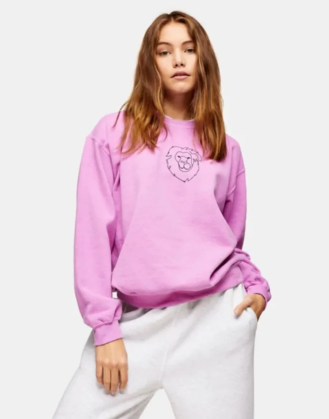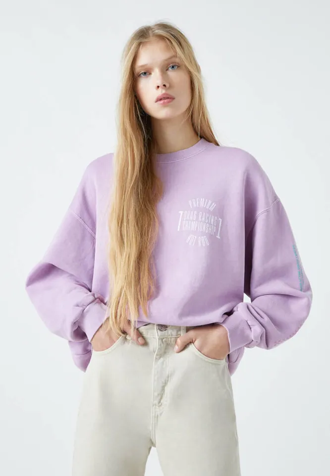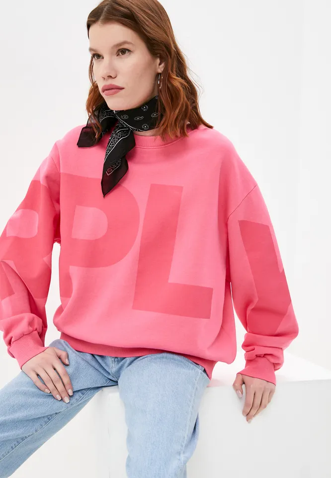 Тем, кто придерживается уличного стиля в одежде, советуем присмотреться к розовому свитшоту с крупными буквами.