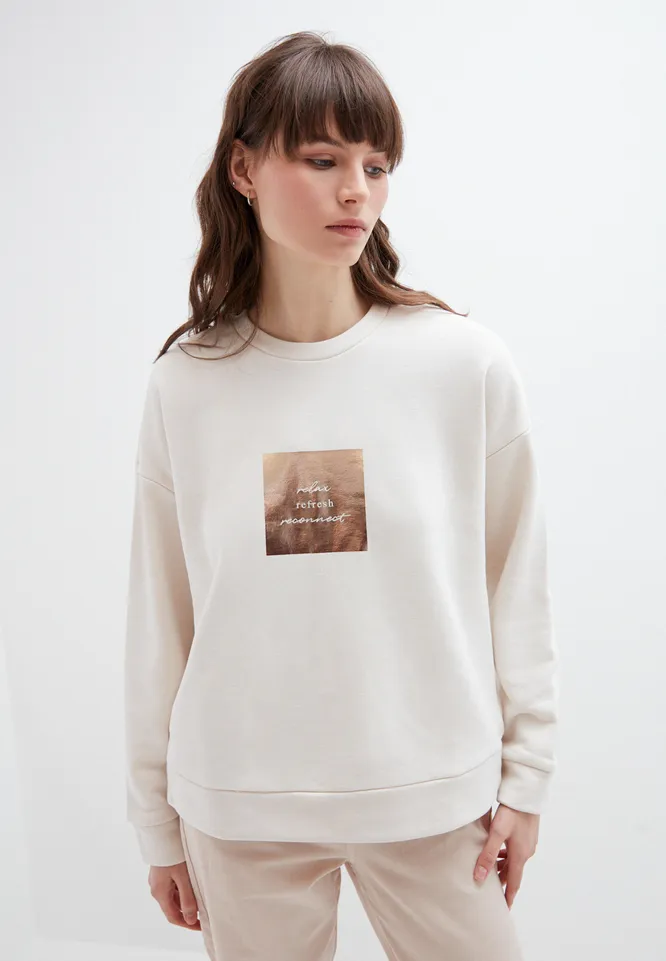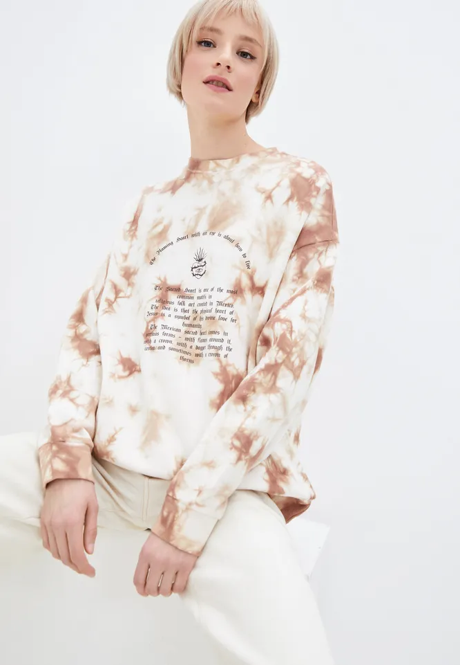 Если ты поклонница скандинавского минимализма и базовых вещей, выбирай бежевый свитшот с лаконичным рисунком.