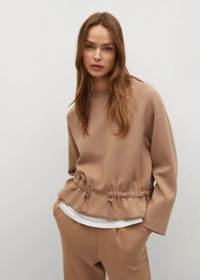 Бежевый свитшот на кулиске добавит аутфитам фактуры и динамичности. Можно сочетать его с трикотажными брюками в тон или моделями из кожи.