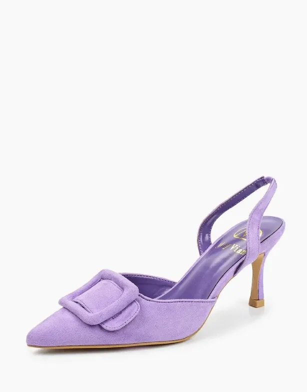 Лавандовый — самый модный цвет весны и лета. Обрати внимание на эти остроносые туфли с декоративной пряжкой и открытой пяткой.