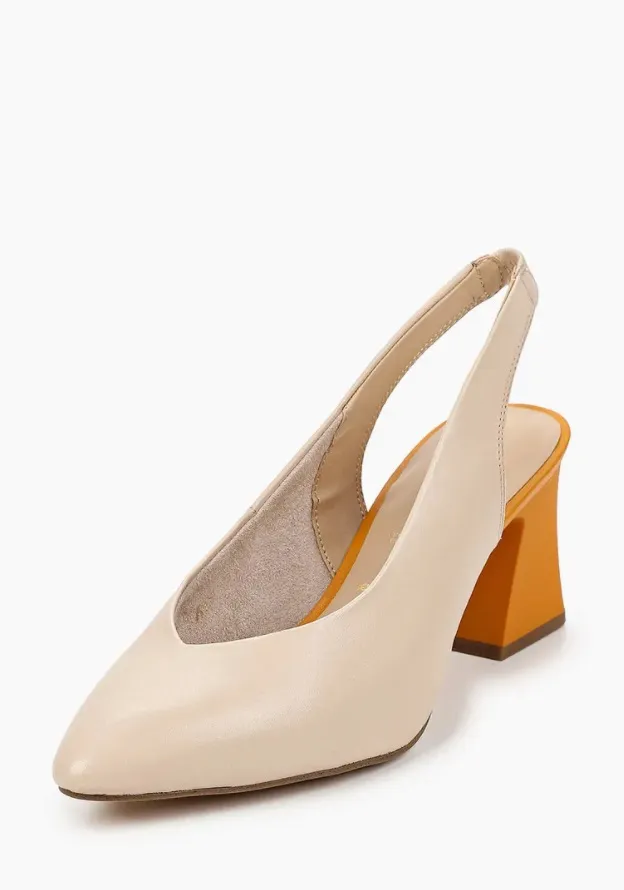 Если ты поклонница классики, выбирай остроносые бежевые туфли с ярким контрастным каблуком.